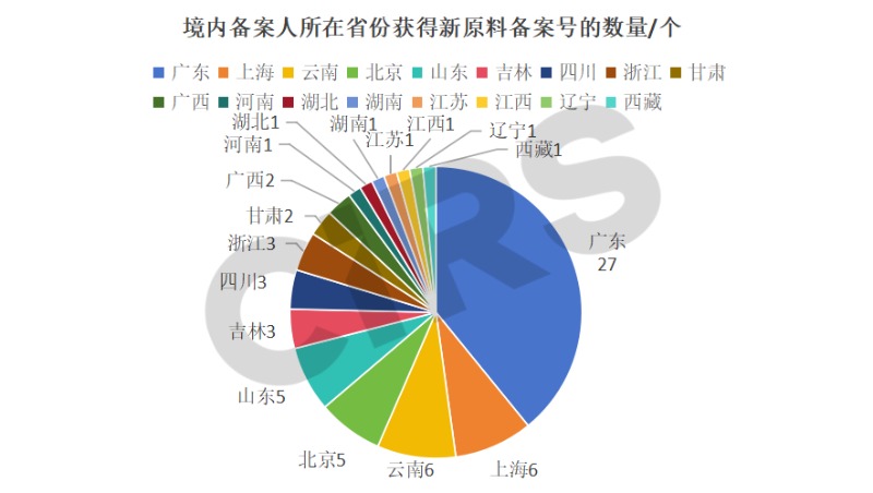 根据对新原料备案数据的分析,69款新原料由中国境内企业完成备案,涉及54家企业,分布于17个省份地区,包括广东、上海、云南、北京、山东、吉林、四川、浙江、甘肃、广西、河南、湖北、湖南、江苏、江西、辽宁和西藏。如下图2所示,在所有境内备案人所属省份中,广东省获得的新原料备案号数量最多,共计27个,约占2025年上半年境内备案人企业新原料备案总数的39.1%。