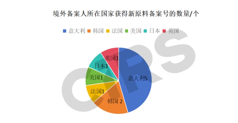 根据对新原料备案数据的分析,11款新原料由中国境外企业完成备案,涉及7家企业,分布于6个国家地区,包括意大利、韩国、法国、美国、日本和英国。如下图3所示,在所有境外备案人中,意大利企业所获得的新原料备案号数量最多,共计5个,约占2025年上半年境外备案人企业新原料备案总数的45.5%。