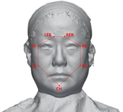 下巴中心(CH)、左脸颊(LC)、右脸颊(RC)、左眼外侧(LE)、右眼外侧(RE)、左眉内端(LEB)、右眉内端(REB)