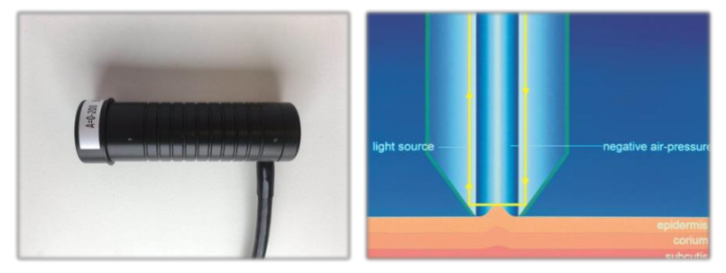 2.吸力法:测试原理是在被测皮肤表面产生一个负压将皮肤轻吸入特定探头内,探头内有非接触式发射器和接收器光学测试系统,测量从施加到消除负压后一段时间内皮肤位移的变化情况,确定皮肤弹性性能。
