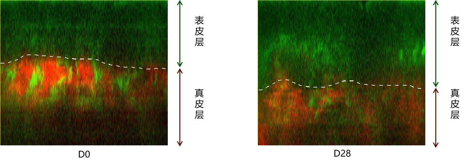 图8. b) 使用产品28天后,上表层逐渐增厚(虚线为真表皮交界处)