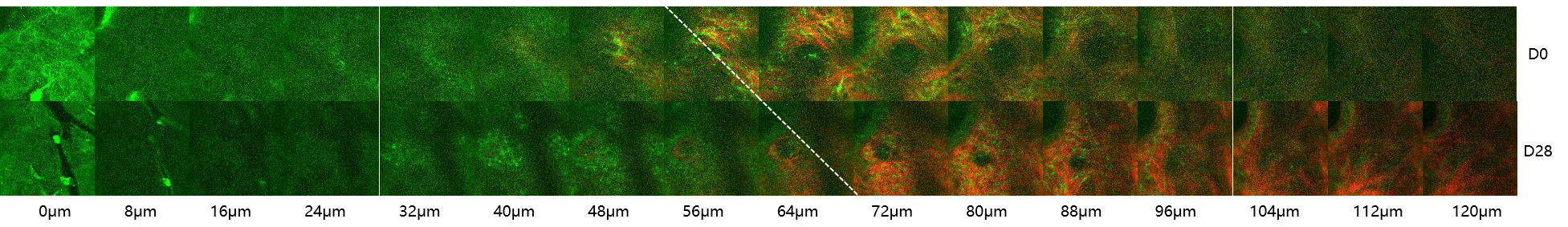 - 随回访周期变化:使用产品28天后,上表皮厚度显著改善8.45%;0μm处为角质层表面;0~40μm处为表皮层;50~60μm处(图示虚线处)为真表皮交界处,红色胶原纤维出现处,可认为是真皮最浅,绿色细胞结构消失处,可认为是表皮最深;60~120μm处为真皮浅层,红色信号为胶原纤维,绿色信号为弹性纤维。