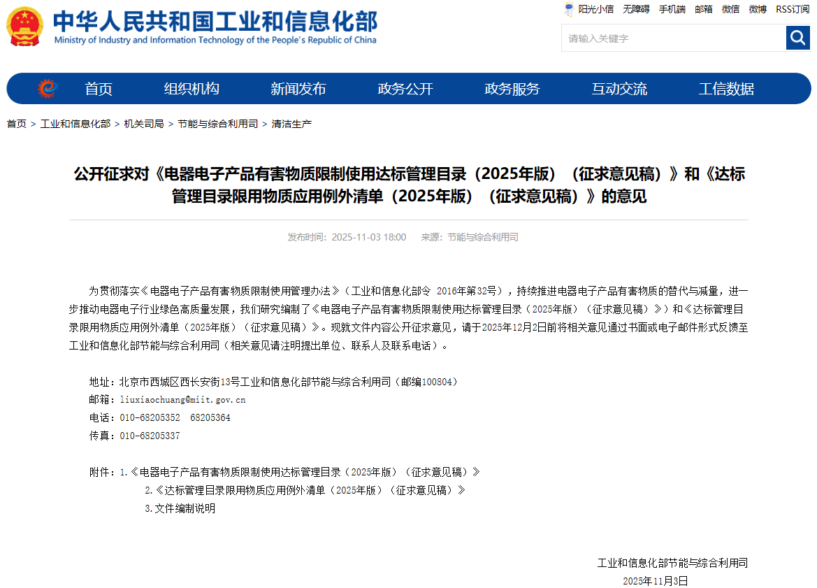 2025年11月3日,中华人民共和国工业和信息化部网站发布了公开征求对《电器电子产品有害物质限制使用达标管理目录(2025年版)(征求意见稿)》和《达标管理目录限用物质应用例外清单(2025年版)(征求意见稿)》的意见的通知,本次公开征求意见截至2025年12月2日。