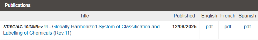2025年9月12日,全球化学品统一分类和标签制度(GHS)第11修订版在联合国UNECE网站发布。目前有英语、法语和西班牙语三个语言版本,中文版还需等待。