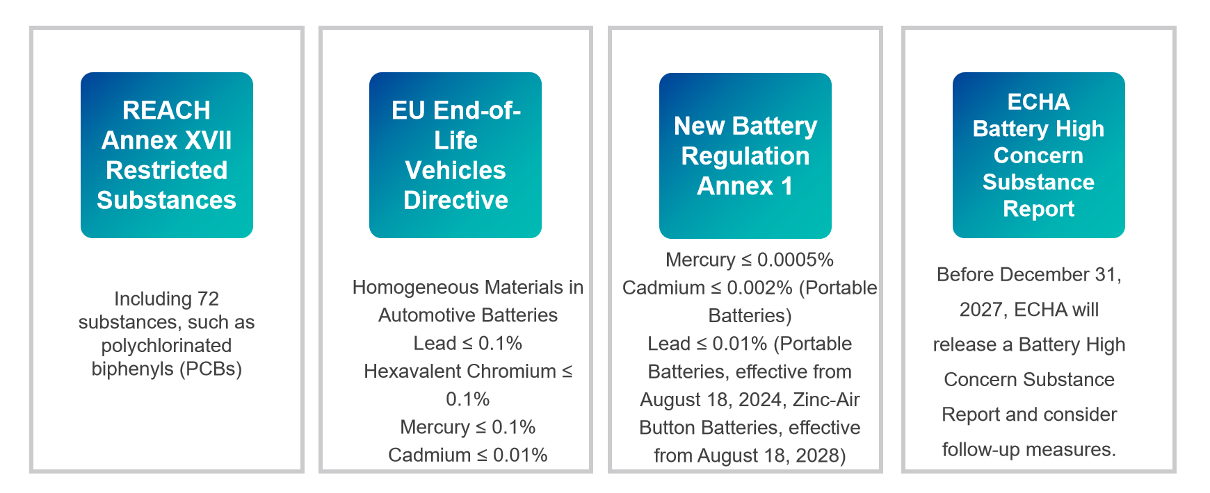 The battery regulation specifies that the content of specific hazardous substances in batteries must be below certain thresholds, primarily involving four limit standards: